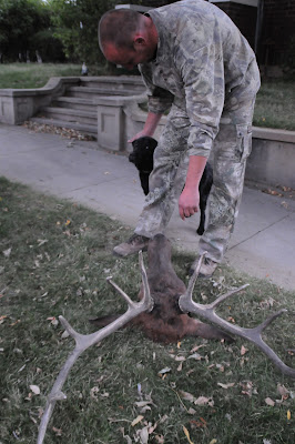 Speaking of gory, the first thing Todd pulled out of the bed of the truck was the elk head. Rigby does not like, or doesn't know what to make of animal parts or animals that have been stuffed. It's super funny how leery he is of them.